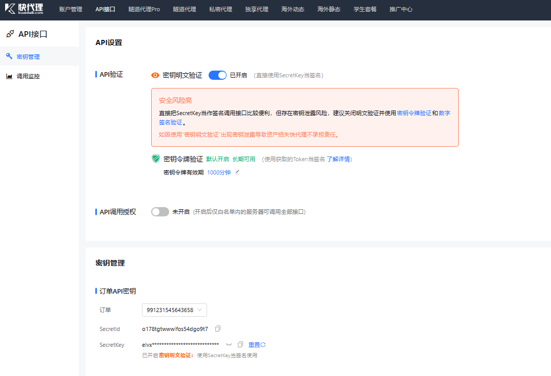 登录快代理会员中心,在「API接口」页面获取 SecretId 和 SecretKey。